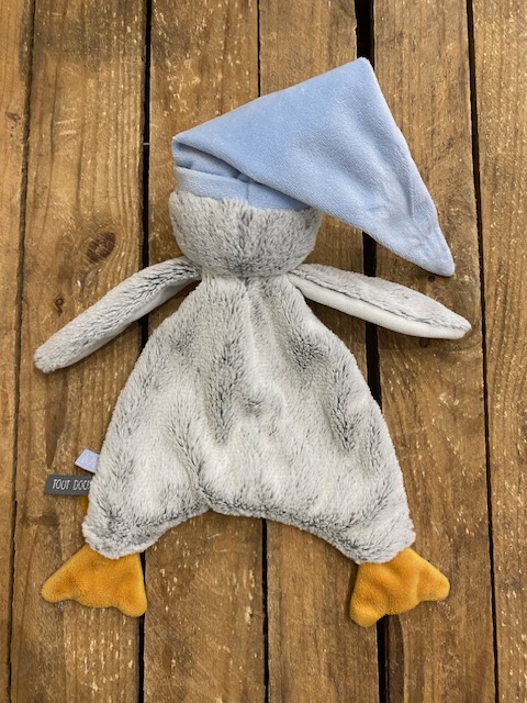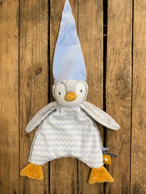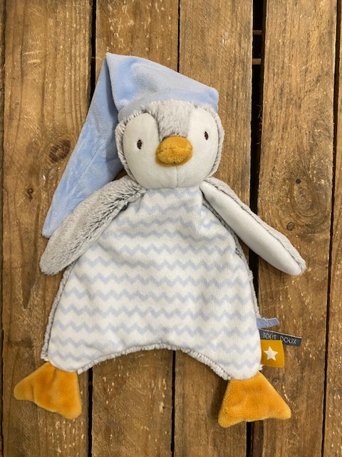 Doudou pingouin plat en velours, de marque TAPE A L'OEIL Dimensions : pingouin environ 25 cm de hauteur (sans le bonnet) Article seconde main, en parfait état, comme neuf ! (étiquette tape à...