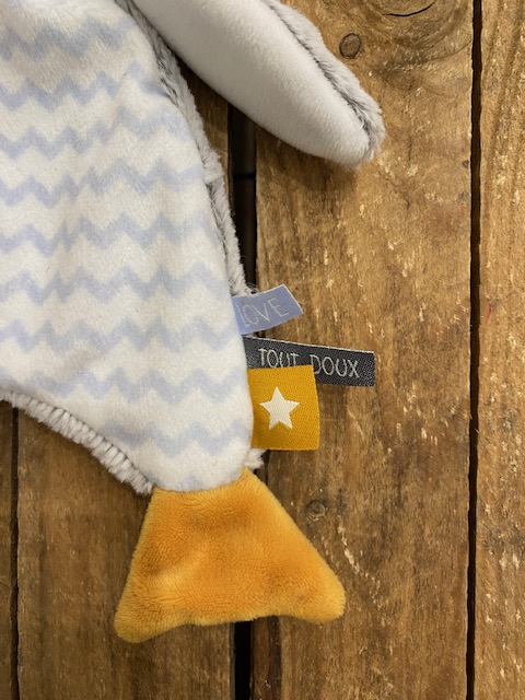 Adorable doudou renard, corps plat en velours, de marque TOM & KIDDY Possède un grelot dans la tête. Couleurs orange/blanc/bleu ciel Dimensions : hauteur de la tête aux pieds environ 24cm Article...