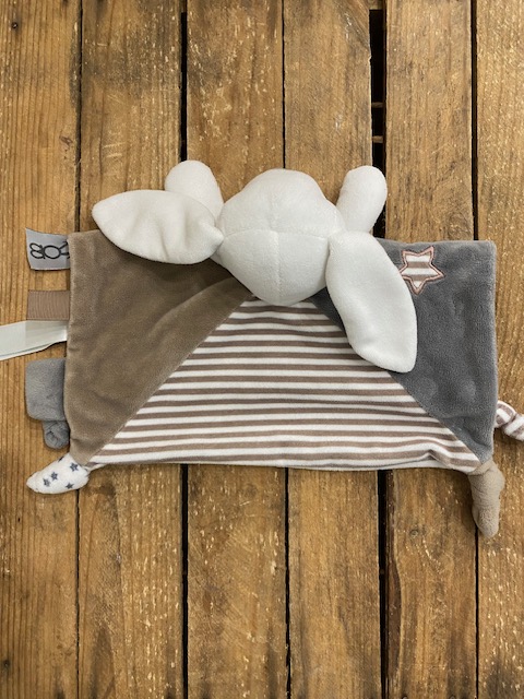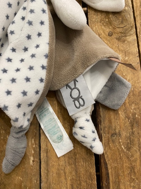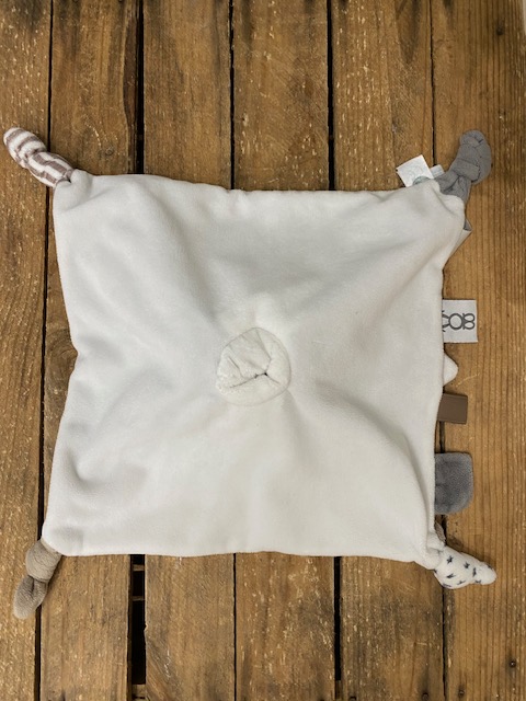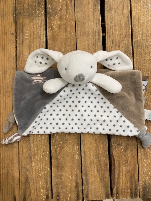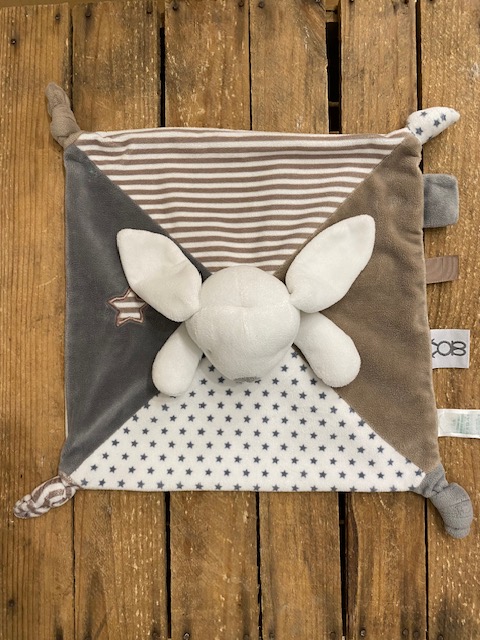 Adorable doudou lapin? corps plat & carré, en velours, de marque OBAIBI Couleurs gris/blanc/marron Dimensions : environ 29cm x 29cm Article seconde main, en très bon état, comme neuf