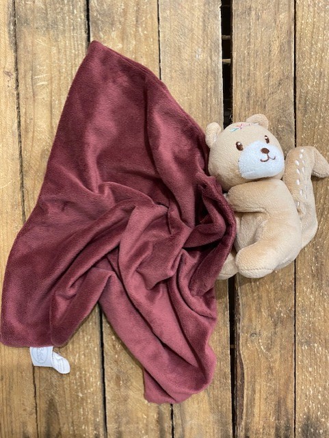 Magnifique doudou écureuil avec un mouchoir plat, en velours, de marque Bébé Douceur